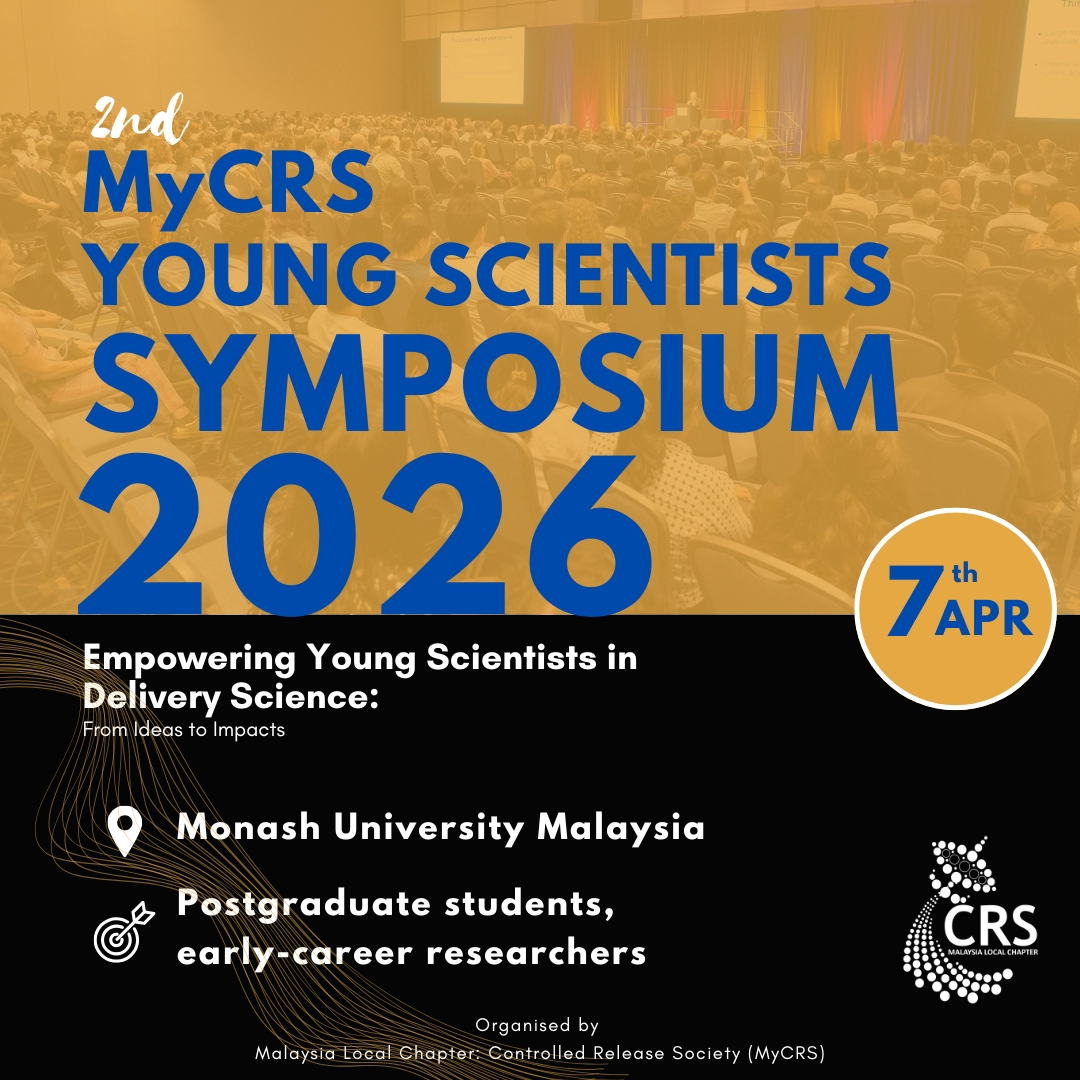 We are thrilled to announce the MyCRS Young Scientist Symposium 2023, centered around the theme “Propelling the Frontier of Innovative Drug Delivery Systems”. The symposium aims to create a platform for young scientists to showcase their discoveries, exchange ideas with peers and professionals, and engage in valuable conversations and debates. Here are the symposium details: